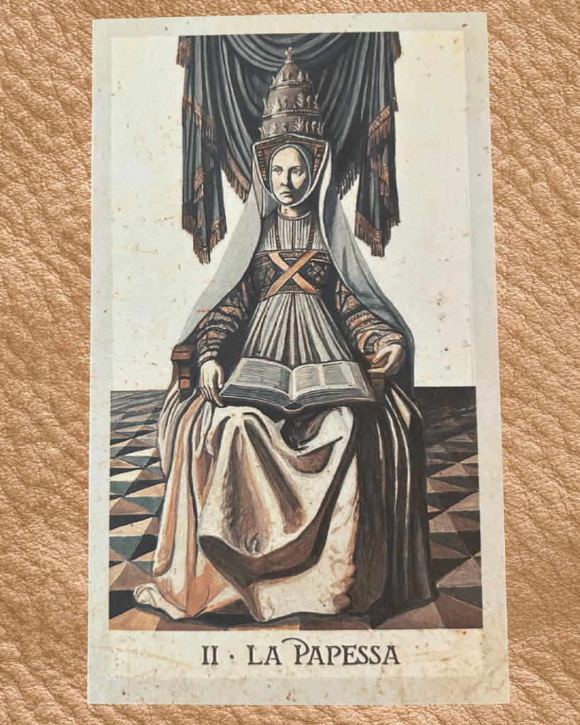 The Visconti-Sforza deck (see left), one of the earliest surviving tarot sets commissioned by the powerful Milanese families around 1450, depicts the Papess as a regal woman wearing papal vestments and a triple crown, directly challenging the male-dominated hierarchy of the Catholic Church. This imagery was particularly audacious given the Church’s absolute authority at the time, and some scholars believe it may have referenced the legendary Pope Joan, a mythical female pope who supposedly ruled in the 9th century. The card’s presence in aristocratic circles suggests that even among the elite, there was a willingness to question and subtly mock ecclesiastical power through the seemingly innocent medium of a card game.