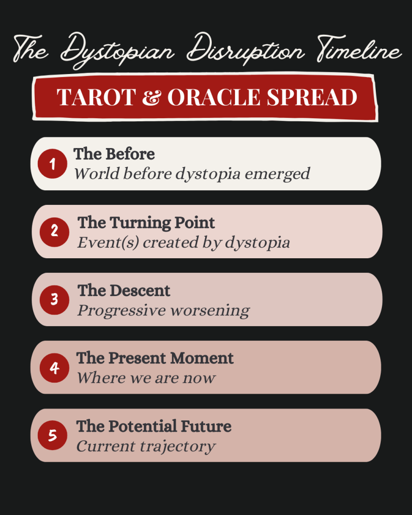 This five-card spread helps you explore how a dystopian situation develops over time.