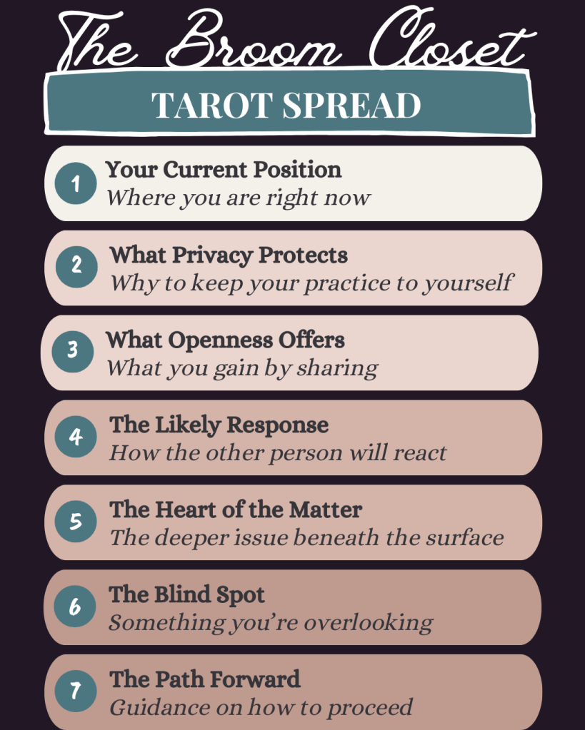 If you’re still uncertain about whether to tell someone about your tarot practice, let the cards guide you. This seven-card spread is designed specifically for this question.