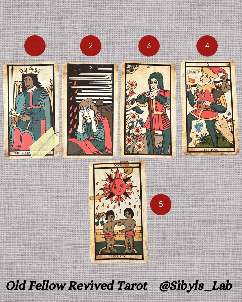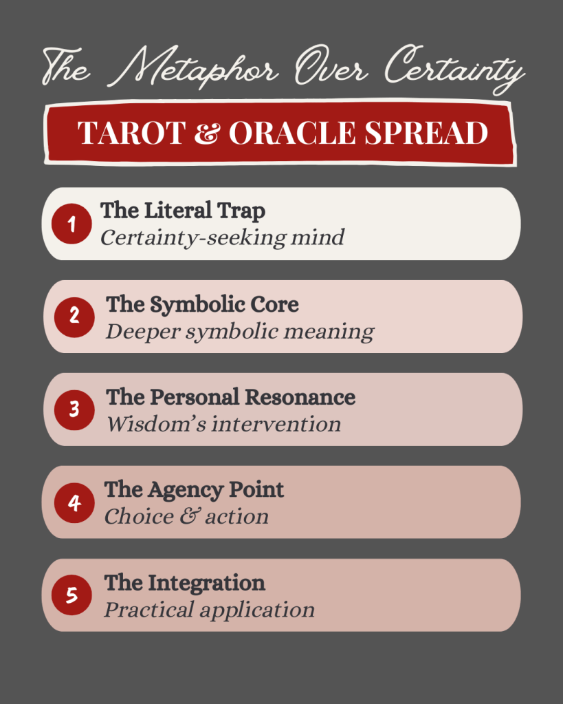 Alright, let’s get practical. Here’s a spread I designed to help you practice shifting from literal to metaphorical thinking. Use this when you’re working on developing your symbolic interpretation skills, or when you catch yourself slipping into fortune-teller mode.