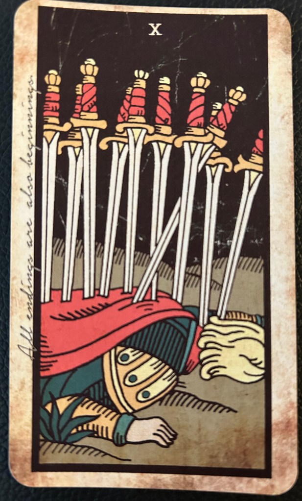 - Metaphorical: “This is the card of rock bottom, but also of the end of suffering. You can’t get more stabbed than this, which means the only direction is up. What painful cycle is finally ending? What dramatic conclusion needs to happen so you can start fresh? Where have you been martyring yourself?”