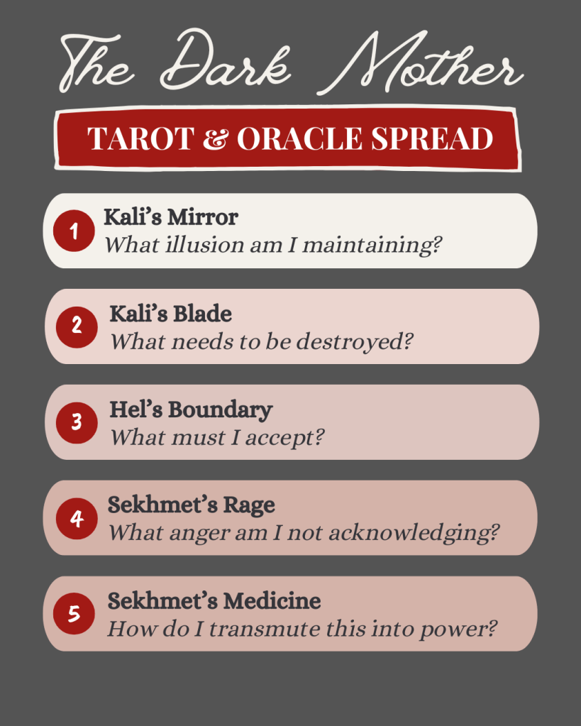 Here’s a five-card spread specifically designed for working with dark goddess energy. You can approach this as a skeptic using archetypal psychology or as a practitioner calling on actual deity energy; the structure works either way.