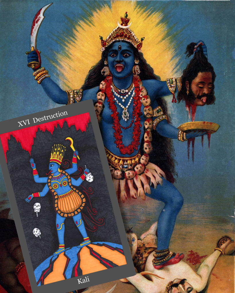 Kali is the Hindu goddess of destruction, time, and transformation. She’s typically depicted wearing a necklace of skulls and a skirt of severed arms, dancing on her consort Shiva’s chest, tongue out, wild eyed. Subtle, she is not. Kali represents the necessary demolition of illusions, the ego death that precedes real growth, and the uncomfortable truth that sometimes things need to burn down completely before they can be rebuilt. She’s what happens when you finally admit that the relationship is over, the career is wrong, the belief system is bankrupt.
